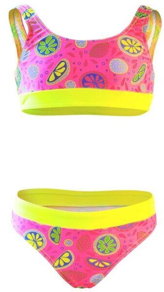 Az Axone LEMONS lány kétrészes fürdőruha szélesebb pántokkal ellátott, kivágott felső résszel rendelkezik a jobb illeszkedés érdekében. A klasszikus szabású fürdőruha alsó higiénikus béléssel van ellátva. A szett mindkét része illeszkedik egymáshoz a kontrasztos sárga szegélynek, fő motívumnak és eredeti nyári mintának köszönhetően. Biztosítsd gyermeked számára a mozgásszabadságot minden alkalommal, amikor a vízbe szökik.