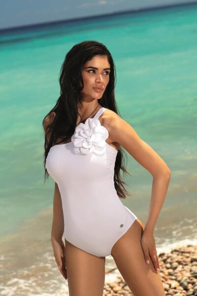 Elegáns, egyvállas fürdőruha - párnázott kosarakkal - nagy bevarrt virággal díszítve - állítható, levehető vállpánt - kiváló minőségű anyag, gyorsan száradó, klór- és napfényálló - klórálló Anyag: 84% poliamid, 16% elasztán