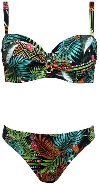 Kétrészes fürdőruha - egzotikus nyomattal díszített mikroszálas - megerősített bardot melltartó aládróttal - aranycsipesz a csészék csatlakoztatásához - levehető vállpántok - áramkör fém klipsszel - állítható pántok és kerület - klasszikus nadrág, belülről szövetréteggel bélelt Összetétel: 85% poliamid, 15% elasztán